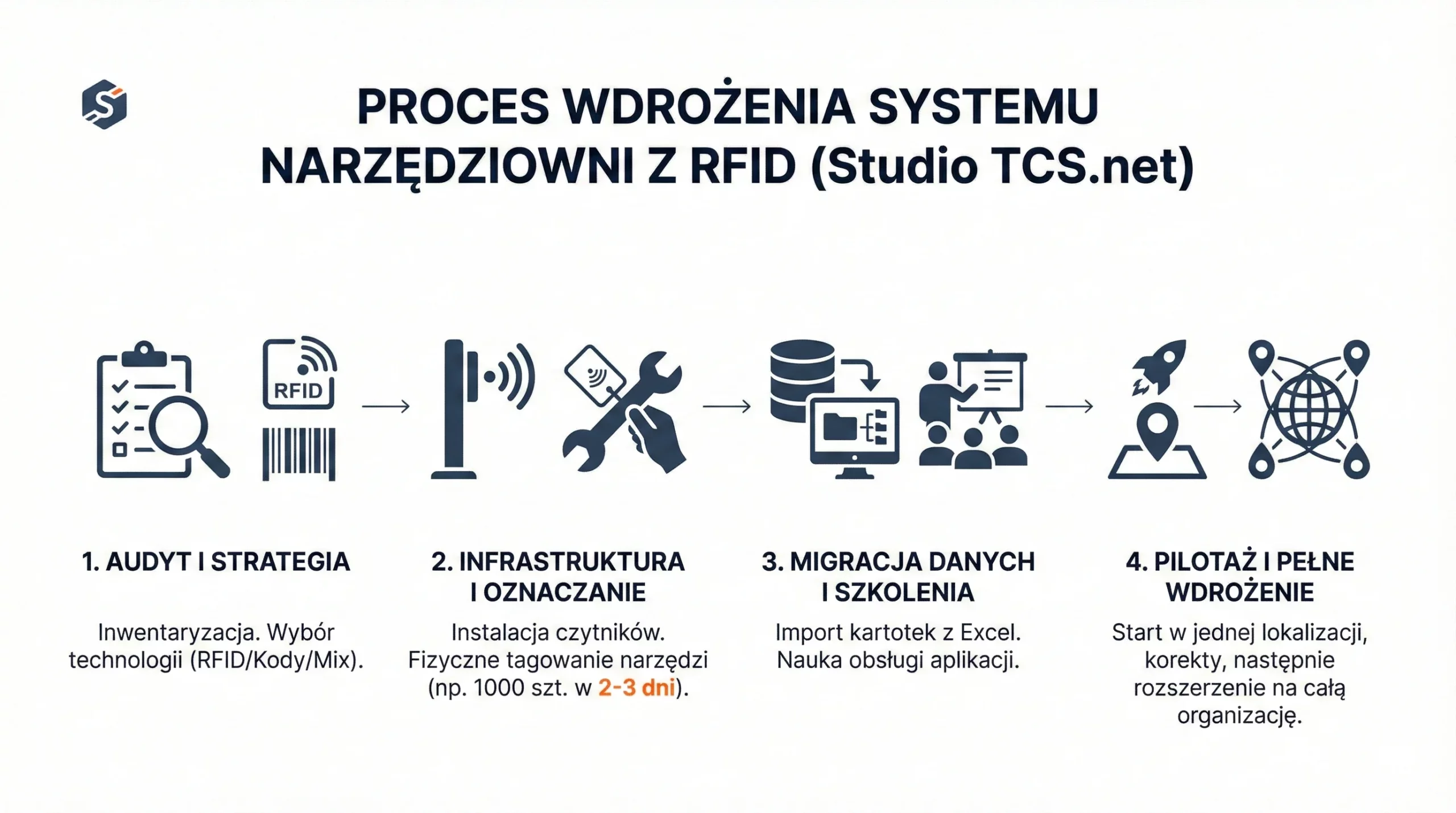 Proces wdrożenia systemu narzędziowni RFID Studio TCS.net w czterech krokach: audyt, infrastruktura, dane i szkolenia.