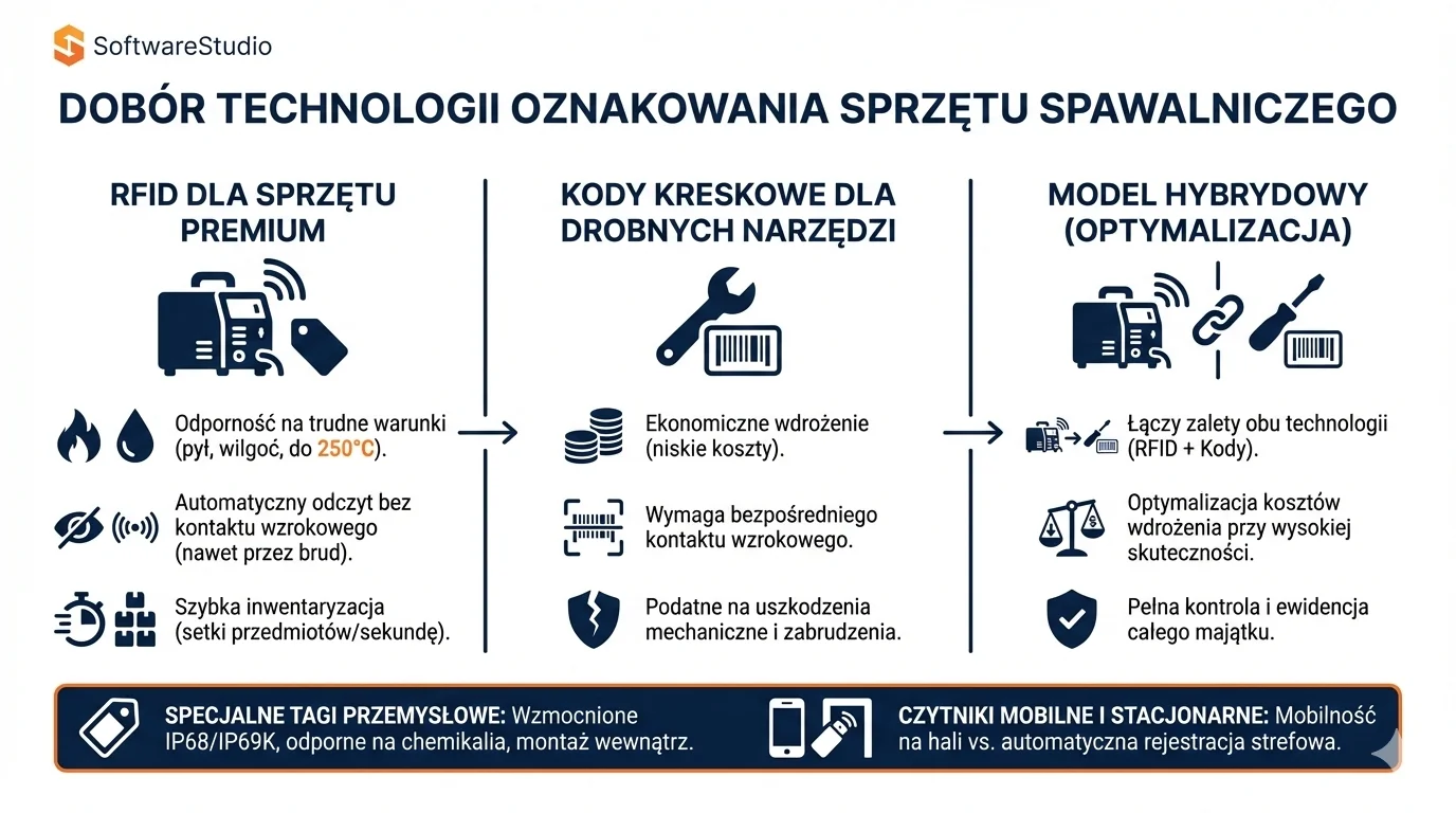 - Model hybrydowy – najbardziej efektywne kosztowo podejście łączące obie technologie. Wartościowy sprzęt spawalniczy oznaczany jest trwałymi tagami RFID zapewniającymi pełną kontrolę i automatyzację, podczas gdy drobne narzędzia otrzymują etykiety z kodami kreskowymi. Takie rozwiązanie pozwala zoptymalizować koszty wdrożenia przy jednoczesnym zachowaniu wysokiej skuteczności ewidencji całego majątku firmy.