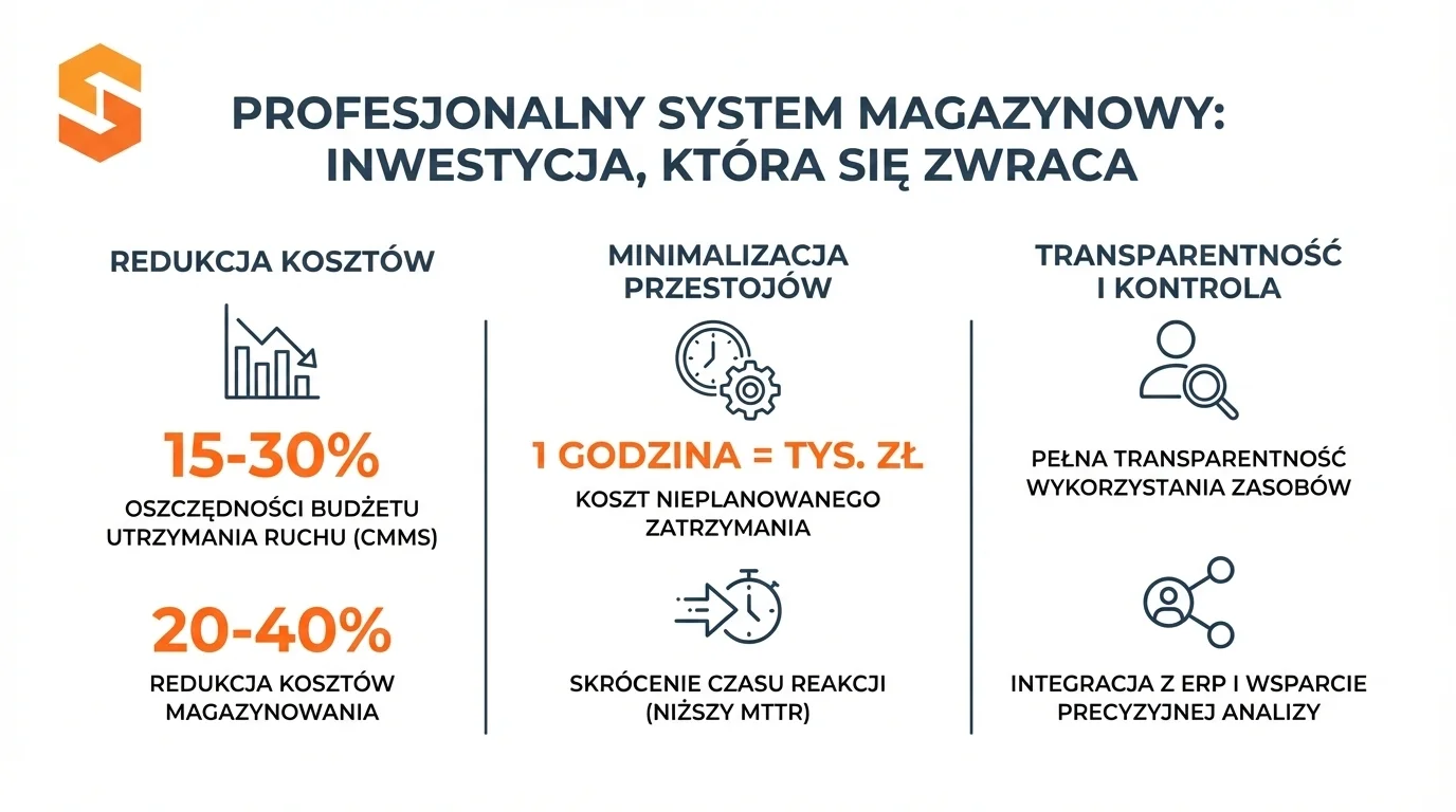 Wdrożenie zaawansowanego oprogramowania do zarządzania magazynem części zamiennych to decyzja strategiczna, która bezpośrednio wpływa na rentowność przedsiębiorstwa produkcyjnego. Organizacje implementujące systemy CMMS mogą zaoszczędzić od 15 do 30% budżetu na utrzymanie ruchu, co przy skali działania średniej fabryki oznacza znaczące kwoty. Inwestycja zwraca się poprzez eliminację kosztownych przestojów – godzina nieplanowanego zatrzymania linii produkcyjnej może kosztować od kilku do kilkudziesięciu tysięcy złotych, uwzględniając utracone przychody, koszty napraw i potencjalne kary umowne.